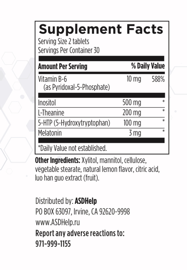Эти таблетки также содержат витамин B6, инозитол и L-теанин для дополнительной помощи в поддержании естественной способности организма успокоиться и заснуть .