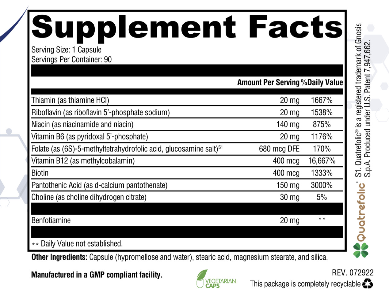 Spectrum B Complex + Benfotiamine содержит витамины В1 (тиамин), В2 (рибофлавин 5 фосфат), В6 (p-5-p) и В12 (метилкобаламин) в их физиологически активной форме, что облегчает их усвоение и делает “готовыми к употреблению”.
