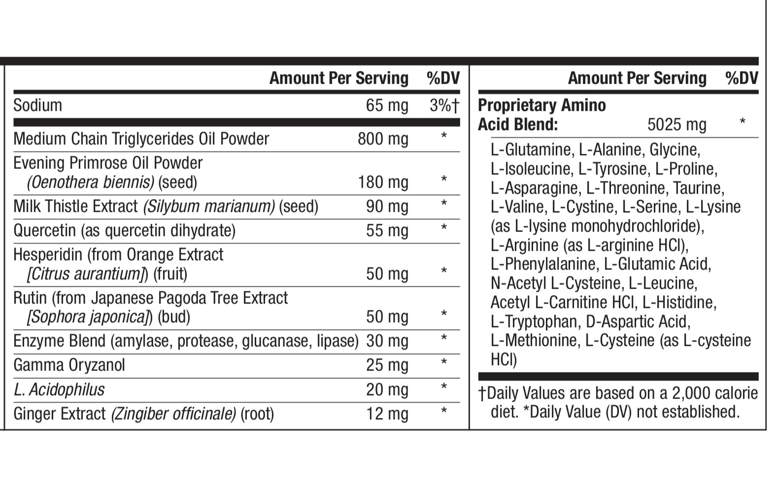 Medium Chain Triglycerides Oil, Evening Primrose Oil (Oenothera biennis) (seed), L. Acidophilus, Milk Thistle Extract (Silybum marianum) (seed), Quercetin (as quercetin dihydrate), Hesperidin (from Orange Extract [Citrus aurantium]) (fruit), Rutin (from Japanese Pagoda Tree Extract [Sophora japonica]) (bud), Enzyme Blend (amylase, protease, glucanase, lipase), Gamma Oryzanol, Ginger (Zingiber officinale) (root) | ||