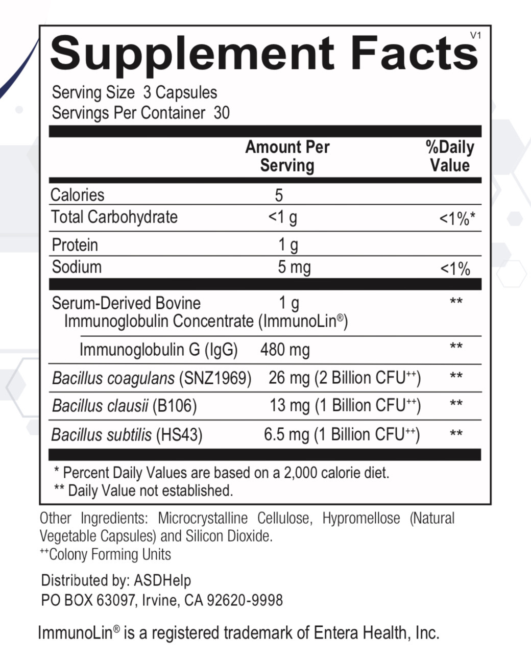 Каждая капсула содержит ключевые спорообразующие пробиотические штаммы Bacillus, которые остаются в защитном состоянии покоя в суровых условиях желудочно-кишечного тракта, но становятся активными при попадании в цель для колонизации и восстановления кишечника. В состав этой формулы входят иммуноглобулины сывороточного происхождения, которые связываются с микробами и токсинами, распространенными в SIBO.