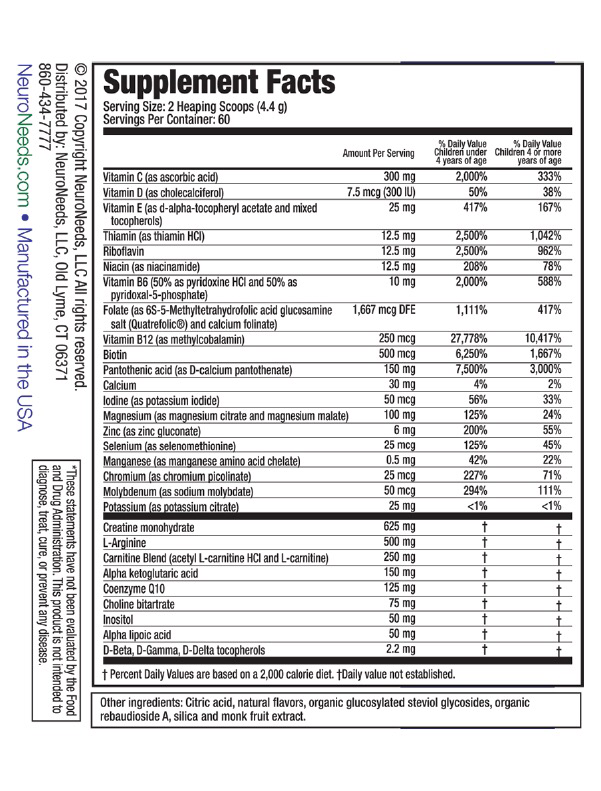 состав: в состав SpectrumNeeds™ входят 33 активных ингредиента, в том числе L-аргинин, коэнзим Q10, L-карнитин, ацетил L-карнитин, альфа-кетоглутарат, L-креатин, альфа-липоевая кислота, тиамин (витамин B1), рибофлавин (B2),ниацинамид (B3), пантотенат D-кальция (B5), пиридоксин (B6), пиридоксаль-5-фосфат (B6), биотин (B7), фолинат кальция (B9), "активированный" фолат (6S-5-L-метилтетрагидрофолатглюкозамин, B9), метилкобаламин (B12), аскорбиновая кислота (C), холекальциферол (D3), d-альфа-токоферилацетат и смешанные токоферилы (E), магний (цитрат и малат), глюконат цинка, пиколинат хрома, марганец (аминокислота)хелат), молибден (молибдат натрия), селен (селенометионин), йодид калия, цитрат калия, моногидрат креатина, битартрат холина и инозит.