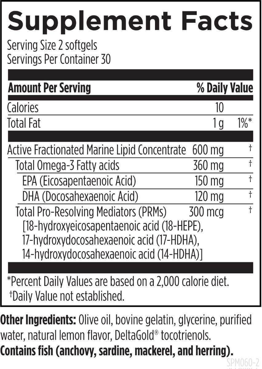 SPM Supreme™ - это комбинация трех высокоэффективных "специализированных прореагирующих медиаторов", разработанных для поддержки естественной способности организма реагировать на физические вызовы и "разрешать" начальные этапы естественного воспалительного процесса.* "Разрешение" здоровой воспалительной реакции - это активный процесс, контролируемый этими уникальными метаболитами.* Рекомендации по применению: принимайте по 2 софтгеля в день или по указанию вашего лечащего врача.* Эти заявления не были оценены Управлением по контролю за продуктами и лекарствами. Данный продукт не предназначен для диагностики, лечения, излечения или профилактики каких-либо заболеваний.