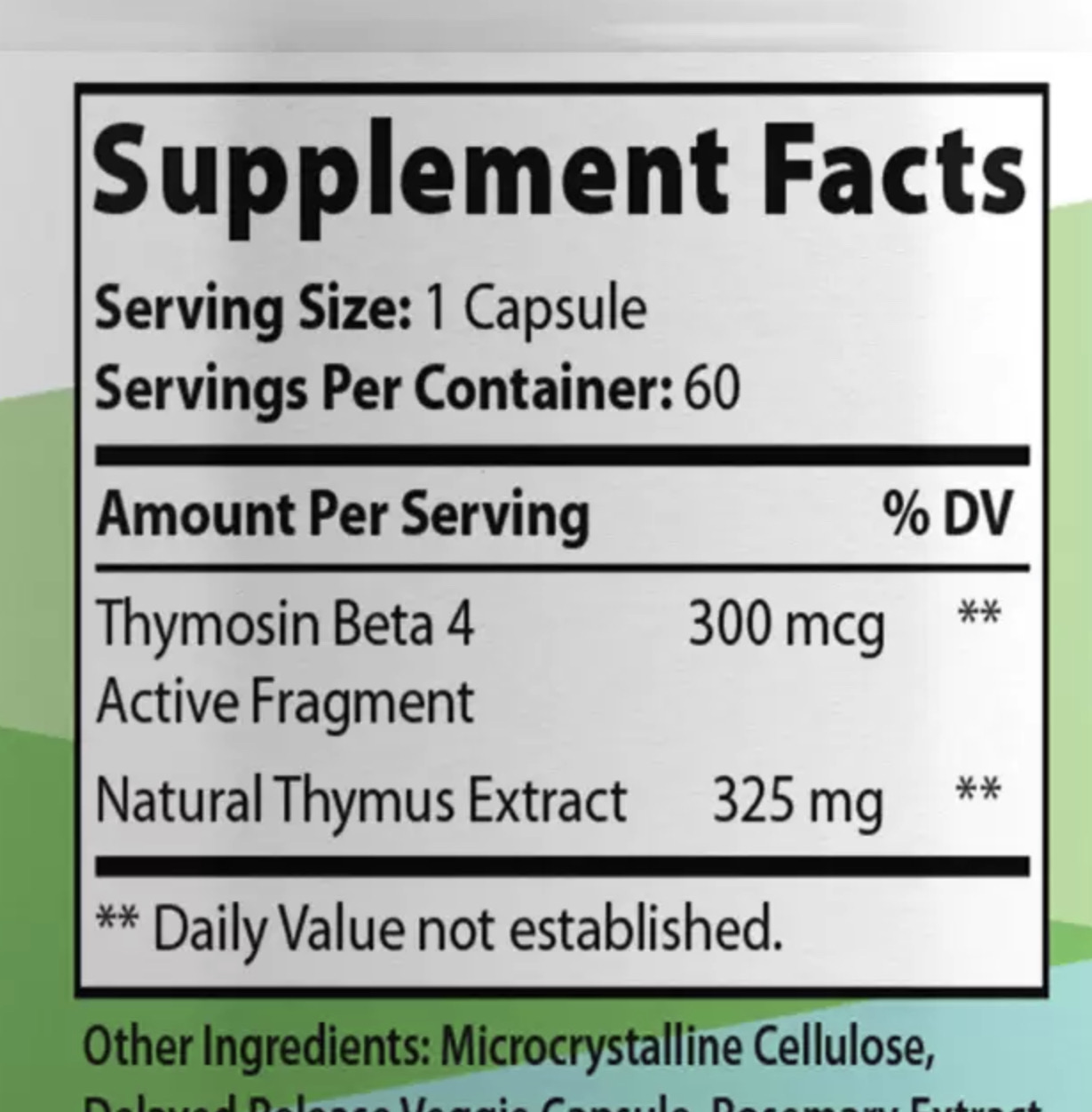 Tβ4 очень хорошо переносится и, как было обнаружено, не вызывает каких-либо существенных побочных эффектов. Его можно принимать как самостоятельно, так и в сочетании с существующей терапией. Содержит высококачественный низкомолекулярный экстракт тимуса из овец (овец).
