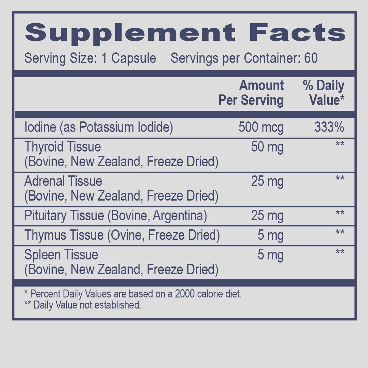 Thyro Complex содержит целевые группы витаминов, минералов, растительных и других натуральных питательных веществ в сочетании с чистыми новозеландскими тканевыми концентратами. В состав этого продукта входят: Ключевые тканевые концентраты из тканей щитовидной железы, надпочечников, гипофиза, селезенки и тимуса. Йод для поддержки выработки и преобразования гормонов щитовидной железы.‡ * Для получения дополнительной информации, пожалуйста, войдите в свой аккаунт, перейдите в раздел "Доступ для практикующих врачей" в разделе "Дополнительные ресурсы", чтобы прочитать письмо, касающееся этого изменения состава