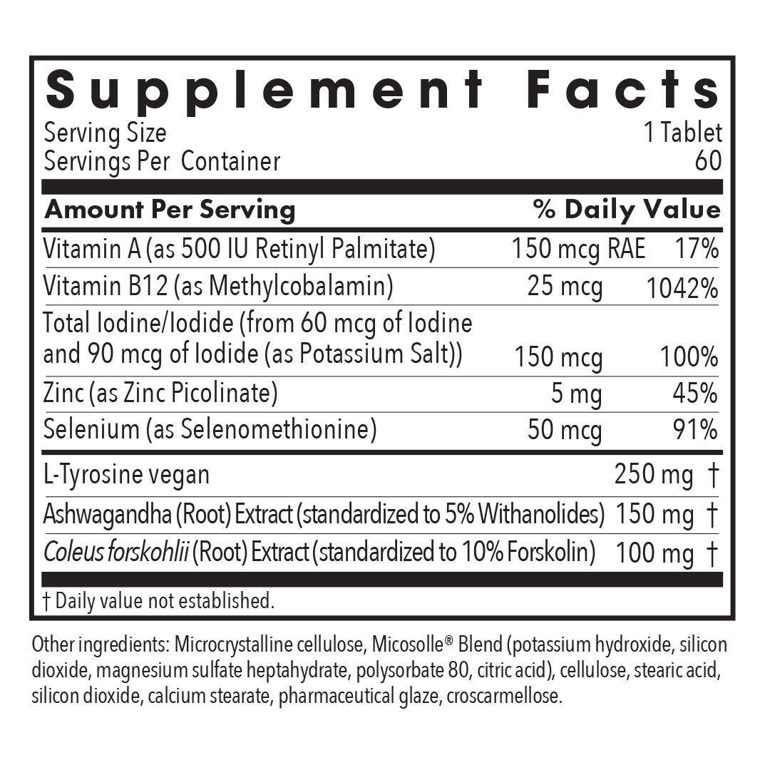 Thyroid Nutrition - это комплексная формула, разработанная для поддержания оптимальной функции щитовидной железы и общего самочувствия. * Он сочетает в себе ключевые питательные вещества, включая йод, селен, цинк, тирозин, витамины A и B12, а также растительные экстракты ашвагандхи и колеуса форсколии для поддержки здорового синтеза гормонов щитовидной железы, устойчивости к стрессу и метаболического баланса.