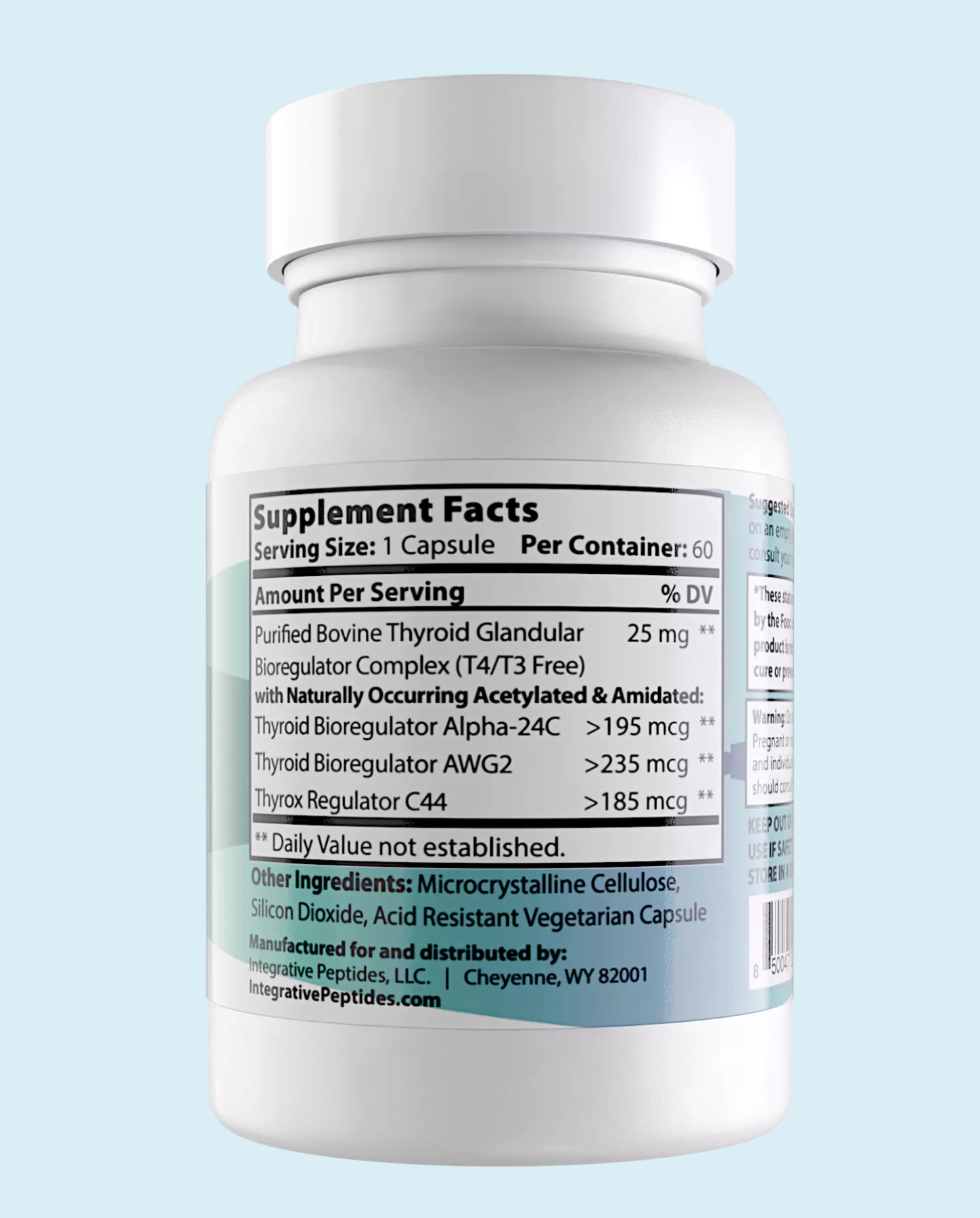Ключевые пептиды — Альфа-24C, AWG2 и C44 — взаимодействуют на молекулярном уровне, улучшая функцию щитовидной железы и укрепляя ее здоровье. Используя принципы терапии щитовидной железы, Тиропеп стремится обеспечить необходимые компоненты, которые могут помочь оптимизировать работу щитовидной железы, и все это в кислотоустойчивой вегетарианской капсуле для достижения максимальной эффективности.