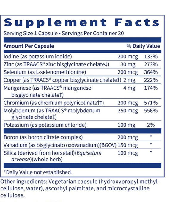 Trace Minerals содержит необходимые минералы и микроэлементы для поддержания минерального статуса и общего состояния здоровья организма. Минералы представлены в хелатной форме для повышения биодоступности и усвоения. Хелатирование - это процесс, при котором неорганические соединения, такие как минералы в их естественном состоянии, связываются с органическими соединениями. Минералы должны быть хелатированы, чтобы усваиваться и использоваться организмом.