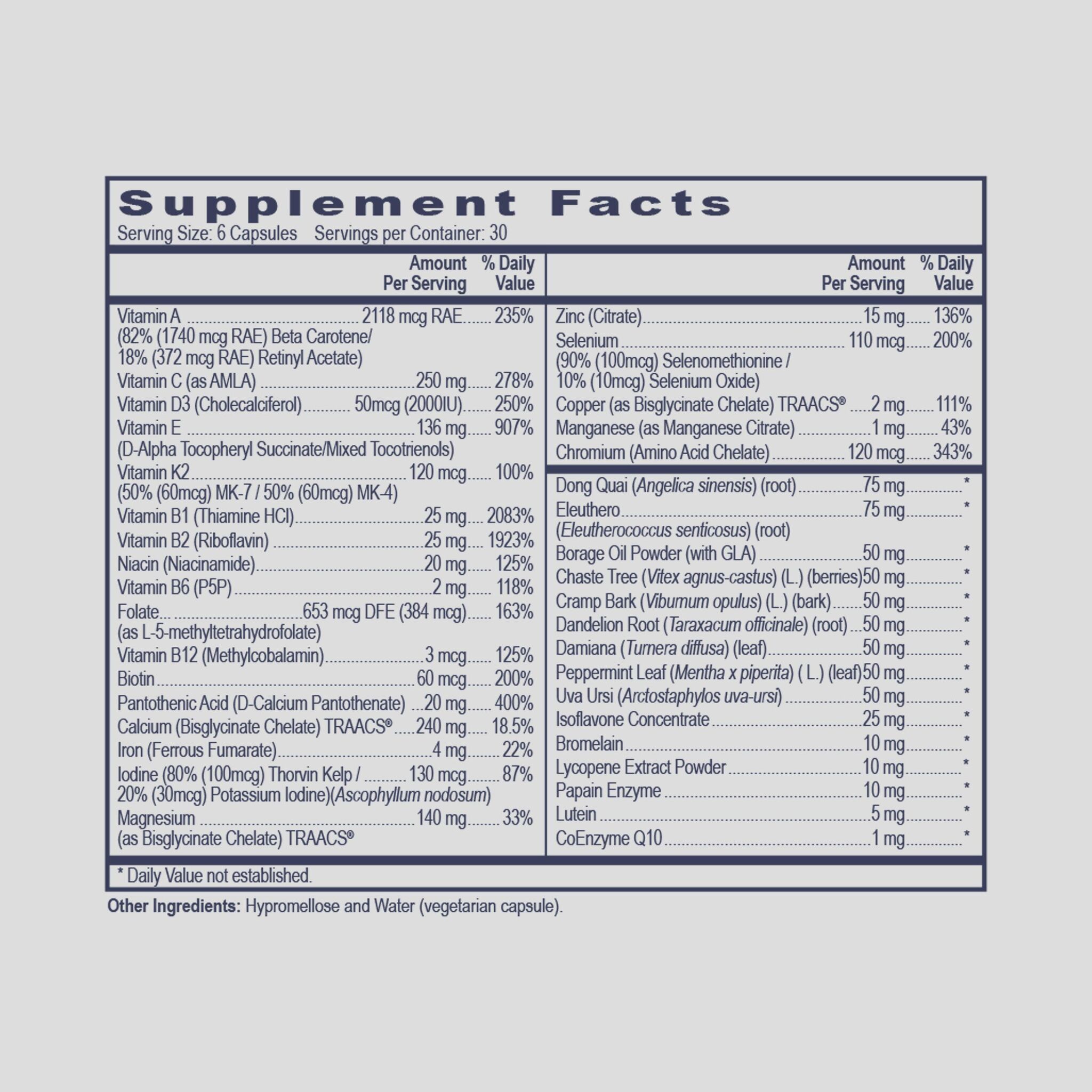 Vibrant Youth for Women is a comprehensive multi-vitamin, mineral, & herbal supplement, with select anti-aging nutrients, designed specifically for the unique needs of women to support metabolism, hormonal balance, immunity, bone-health, thyroid & adrenal function.‡ A complete blend of activated vitamins including vitamin A (as beta carotene and activated form, retinyl acetate), Vitamin C (as whole food AMLA), Vitamin D3, Vitamin K2 as MK-7 & MK-4, Vitamin B1, B2, B3, B5, B6, methylated folate (B9), and methylcobalamin (B12). A complete blend of activated minerals including iodine from Thorvin ® organic kelp, Albion ® TRAACS ® magnesium bisglycinate chelate, iron, calcium, zinc, selenium, copper, manganese & chromium An array of select herbs to support female physiology, metabolism and hormonal systems.‡ An array of select herbs to support female physiology, metabolism and hormonal systems.‡ Gamma linolenic acid (GLA), an important essential fatty acid that may aid in balancing hormones.‡ Antioxidants to fight oxidative stress, which if left unmanaged may lead to early signs of aging.‡