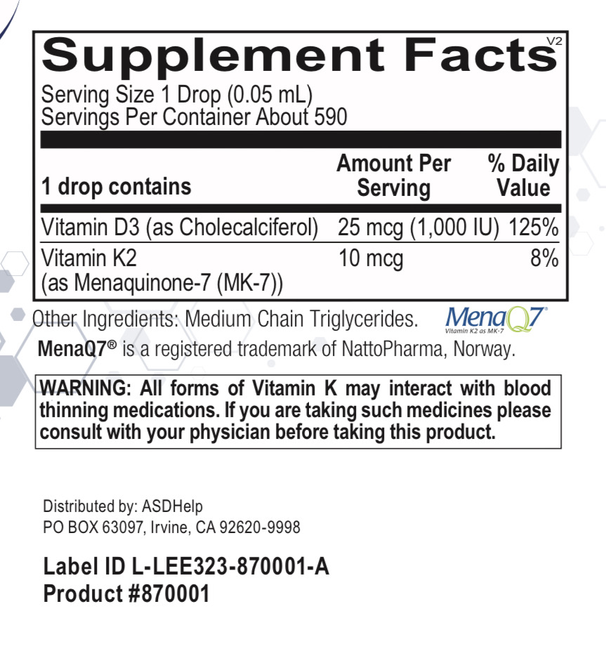 Витамин D3 + K2 включает 10 мкг MenaQ7 , наиболее широко изученной формы витамина К2 в виде MK-7 и 1000 МЕ витамина D3 в каплях для оптимального усвоения и использования организмом.